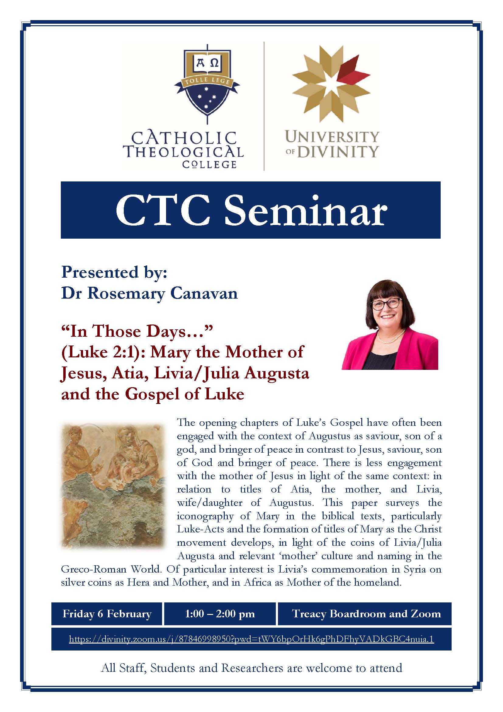 This paper by Dr Rosemary Canavan, Senior Lecturer at CTC, surveys the iconography of Mary in the biblical texts, particularly Luke-Acts and the formation of titles of Mary as the Christ movement develops, in light of the coins of Livia/Julia Augusta and relevant ‘mother’ culture and naming in the Greco-Roman World. Of particular interest is Livia’s commemoration in Syria on silver coins as Hera and Mother, and in Africa as Mother of the homeland.