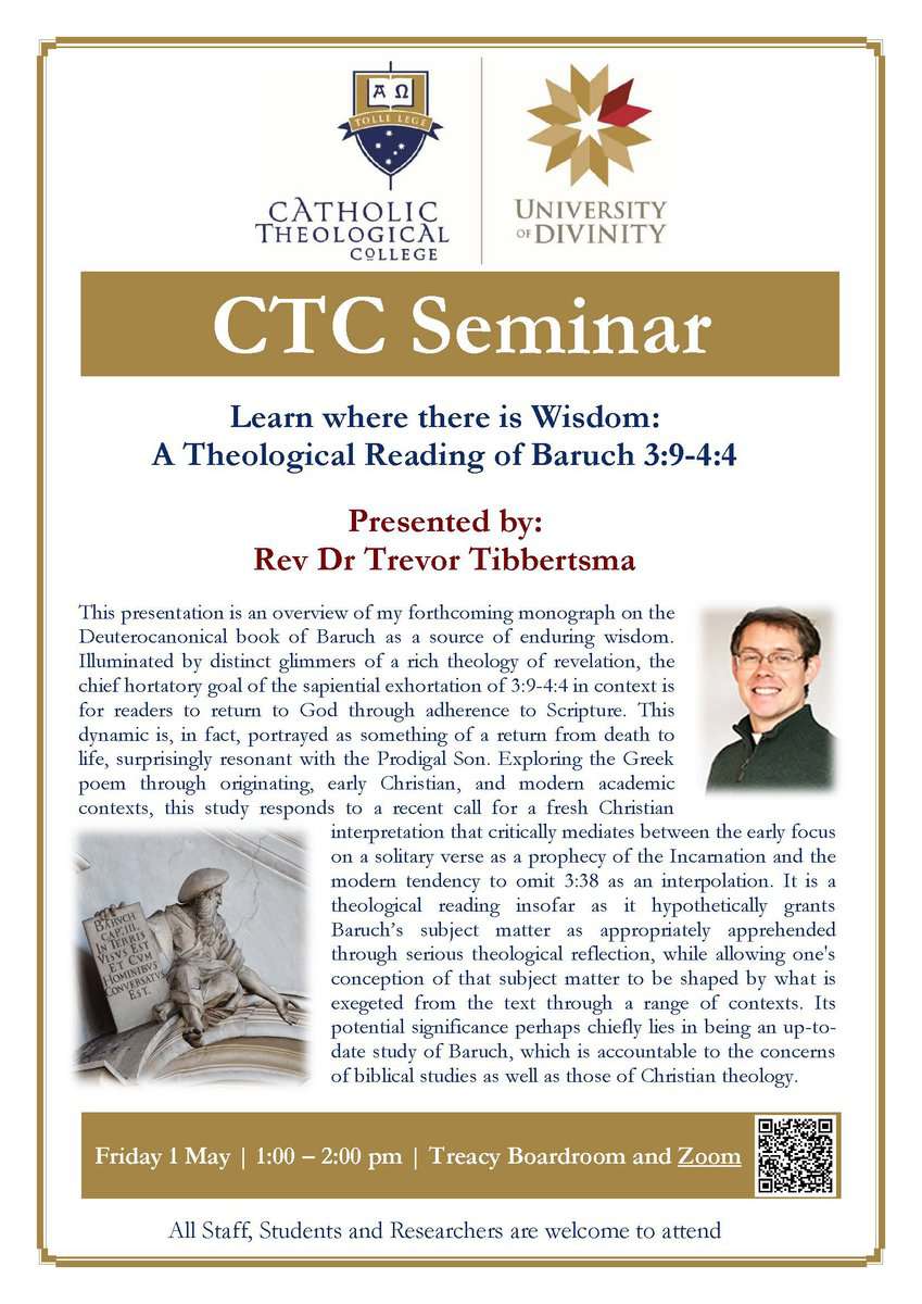 Join us online for the next CTC Seminar presented by Rev Dr Trevor Tibbertsma on Learn where there is Wisdom: A Theological Reading of Baruch 3:9-4:4.