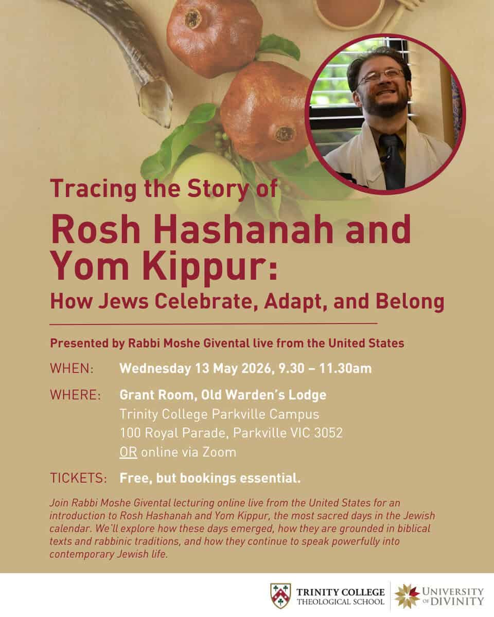 You are invited to attend a free public lecture, Tracing the Story of Rosh Hashanah and Yom Kippur: How Jews Celebrate, Adapt, and Belong, presented by Rabbi Moshe Givental through Trinity College Theological School. You will be joining students studying the Semester 1 unit, From Song of Songs to Lamentations: Biblical Voices in Contemporary Jewish Festivals, co-taught by Associate Professor Rachelle Gilmour and Dr Natalie Mylonas, who have been exploring the Five Scrolls in the Hebrew Bible (Song of Songs, Ruth, Lamentations, Ecclesiastes, and Esther), examining both their biblical contexts and their integral role in contemporary Jewish liturgy and festival observance.